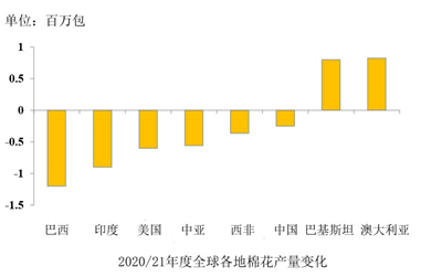 产量 2020/21年度,巴西、印度、美国、中亚、西非和中国的产量预计减少,巴基斯坦和澳大利亚产量预计增加。具体看,美国棉花产量预计为1950万包,同比减少60万包,原因是种植面积减少和弃收率连续第二年接近中等水平。印度棉花价格不如竞争作物,植棉面积预计减少3%。如果季风雨正常、单产没有明显变化,棉花产量预计减少90万包,为2050万包,同比减少大约3%。巴西植棉面积减少,棉花产量预计为1150万包。中亚和西非的产量也预计减少,但减幅小于美国。2020年1月开始,澳大利亚降雨显著增多,后期天气有望恢复正常,棉花产量预计增加80万包,达到150万包,为长期均值的一半左右。巴基斯坦棉花产量预计恢复到740万包,同比增加80万包,仍是三十年来的最低水平之一。