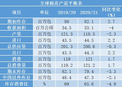 根据2月21日美国农业部农业展望论坛的预测,2020/21年度全球植棉面积预计为3310万公顷,同比减少4%。全球棉花产量预计为1.185亿包,同比下降...">