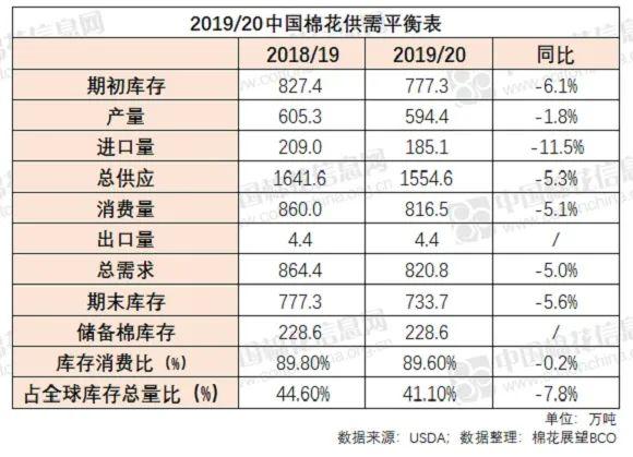 贸易量:消费减少必然会影响中国国内对进口棉的需求,因此本年度棉花进口量预期185.1万吨,同比减少11.8%。除受下游需求端影响之外,本年度初期处于历史高位的工商业库存量也对进口需求造成挤压。但即使在进口量预期减少的情况下,中国仍然是全球最大的棉花进口国,同时本年度进口量预期也处于近6个年度高位。 期末库存量:中国棉花期末库存量预期734.7万吨,同比减少5.4%。其中储备棉库存量预期228.6万吨,与上一年度基本持平。 二、2020/21年度: 产量:2020/21年度中国棉花总产预期587.9万吨,较本年度调减1.1%。从种植面积来看,根据USDA对于新年度植棉意向调查情况统计,预计将有所减少。新疆新年度单产增加的预期抵消了一部分面积减少带来的影响,因此总产预期降幅较小。 从历史数据统计来看,在1982/83年至2014/15年度期间,中国一直蝉联全球棉花产量冠军的宝座,之后到2017/18年度期间被印度超过,接下来的2018/19年度中国短暂的重夺冠军位置,但根据目前对于本年度和下年度的产量预期来看,我们又将被印度再次反超。 消费量:2020/21年度中国棉花消费量预期838.2万吨,较本年度调增2.7%;占全球消费总量的31.8%,与本年度基本持平。整体来看,虽然下年度消费量预期同比略有调增,但依然位于自2015/16年度之后的次低点。此次预期主要是基于一是中国将摆脱新冠疫情的影响,二是中美贸易摩擦压力有所缓解,这两点对于下游消费端来说都将带来不同程度的利好。从60时代中期至今,中国一直是全球棉花消费量最高的国家,但是在2009年之后其占全球棉纺市场的份额出现明显减少,后至今相对持稳。