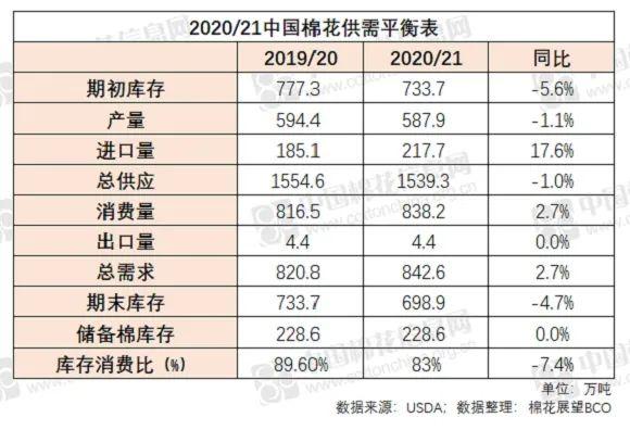 贸易量:2020/21年度中国棉花进口量预期217.7万吨,较本年度增加17.6%。其中USDA预测称本年度中国将轮入相近数量的国内棉花和进口棉,为2020/21年度的储备棉轮换做准备。(我们不生产预期,我们只是预期的搬运工) 期末库存量:2020/21年度中国棉花期末库存量预期698.9万吨,较本年度调减4.7%。 储备棉预期:除产消情况之外,USDA还大胆对新年度的储备棉相关情况进行预期。USDA预测称2021年春季期间中国可能进行储备棉轮出。到2020/21年度末,储备棉库存量预计将恢复至目前228.6万吨的水平。