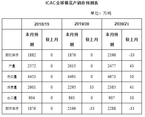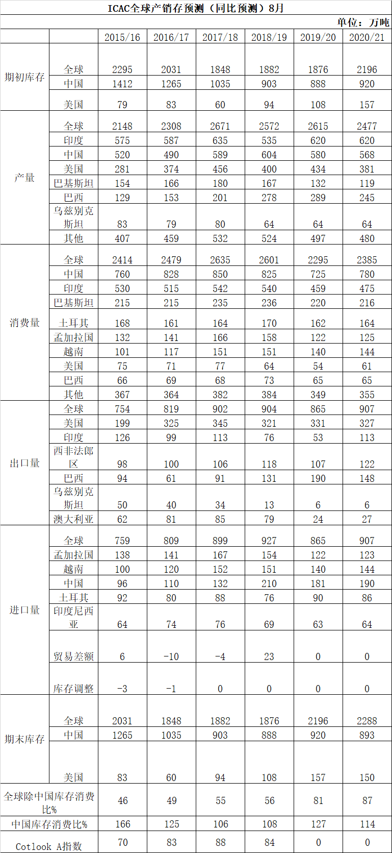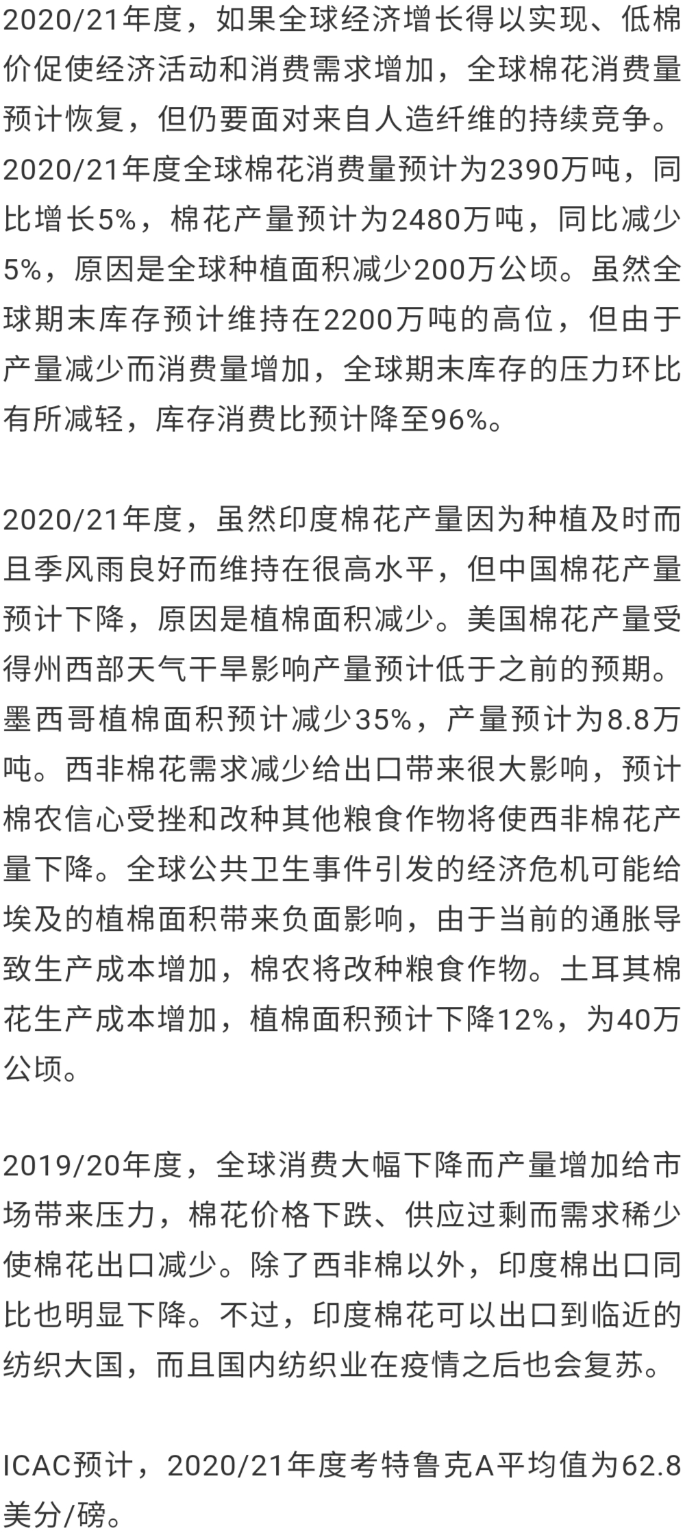国际棉花咨询委员会(ICAC)发布的8月份全球产需预测认为,2020/21年度国际棉价预计下跌。