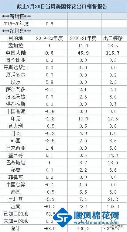 8月6日消息,美国农业部(USDA)周四公布的出口销售报告显示,7月30日止当周,美国2019/2020年度陆地棉出口销售净减6.85万包,较前一周及前四...">