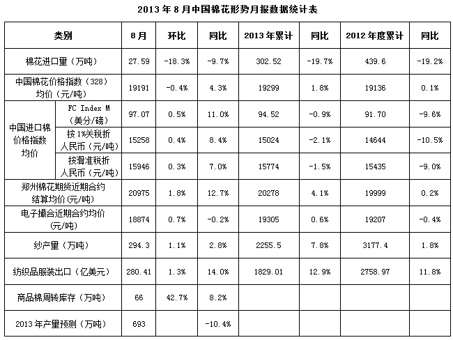 年度末期,储备棉投放结束,市场各方多持观望态度,棉花现货成交清淡,价格微幅下跌。中国棉花价格指数(CC Index328)8月均价19190元/吨,环比下跌0.4%,同比上涨4.3%。纺织企业前期购买储备棉部分未提货,全国商品棉周转库存总量约为66万吨,环比增加。