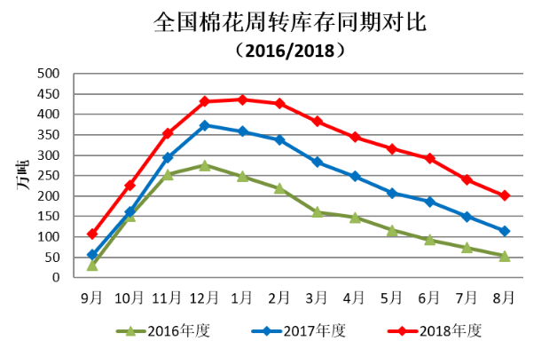 项目承担:中国棉花协会棉花物流分会 监测对象:18个省市区164家棉花专业仓储仓库 8月,中美贸易摩擦再次升级,美宣布对自华进口的约3000亿美元商品加征10%关税,中方采取反制措施,对原产于美国的约750亿美元商品加征10%、5%不等关税。受此影响,棉花价格加速下滑,纺织企业保持观望,月末全国棉花周转库存量继续下降,但降幅较上月收窄。据中国棉花协会棉花物流分会对全国18个省市的164家棉花交割和监管仓库调查数据显示:8月底,全国棉花周转库存总量约200.86万吨,较上月减少38.76万吨,下降量收窄13.36万吨,同比仍高86.8万吨。