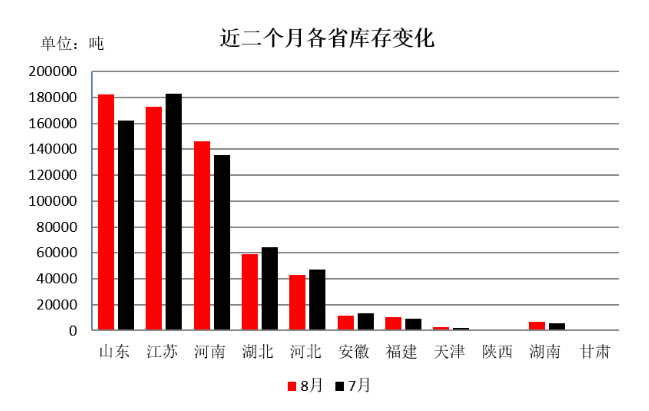一、内地商品棉周转库存情况 截至8月底,内地商品棉周转库存63.68万吨,环比增加1.23万吨;含新疆棉54.79万吨,已通关进口棉2.71万吨,地产棉6.18万吨。 从各省库存分布情况看:山东省库存量居首位,为18.26万吨,江苏省次之17.31万吨,河南省居第三位14.64万吨,湖北省5.90万吨,河北省4.29万吨,安徽省1.14万吨,福建省1.02万吨,其他省在万吨以下。 从库存量变化情况看,增加和减少的省份各半,整体增加的量略大于减少的量。其中,增幅最突出的是山东省,较上月增加2.03万吨;其次是河南,增加1.07万吨。减幅最突出的是江苏省,减少1.01万吨;湖北省减少0.53万吨;河北省减少0.45万吨;安徽省减少0.22万吨;其他省份波动都在0.2万吨以下。