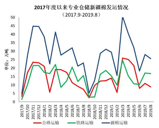 三、专业仓储新疆棉出疆运输 8月,新疆棉花专业仓储库出疆发运量为25.62万吨,环比下降2.43万吨,同比增加2.65万吨。 2018年9月-2019年8月,出疆棉公路与铁路共发运317.86万吨,同比减少39.61万吨,降幅11.08%。