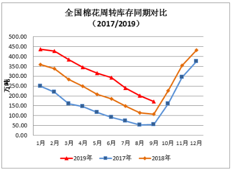 项目承担:中国棉花协会棉花物流分会 监测对象:18个省市区164家棉花专业仓储仓库 9月,中美贸易摩擦出现缓和,市场预期略有好转,储备棉轮出成交量有所提高。新棉即将上市,市场资源充裕,纺织企业坚持随用随买,月末中国棉花商业库存继续下降。据中国棉花协会棉花物流分会对全国18个省市的164家棉花交割和监管仓库调查数据显示:9月底全国棉花周转库存总量约171.32万吨,较上月减少29.54万吨,同比仍高64.04万吨,但这一差距较上月收窄22.76万吨。