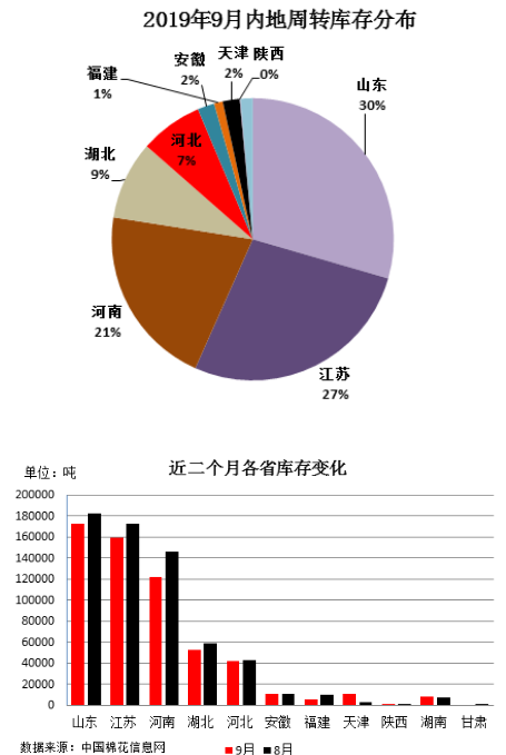 一、内地商品棉周转库存情况 截至9月底内地商品棉周转库存58.77万吨,环比减少4.91万吨;含新疆棉49.05万吨,已通关进口棉2.14万吨,地产棉7.58万吨。 从各省库存分布情况看:山东省库存量居首位,为17.32万吨,江苏省次之15.98万吨,河南省居第三位12.23万吨,湖北省5.27万吨,河北省4.22万吨,安徽省和天津市均为1.14万吨,其他省在万吨以下。 从库存量变化情况看,大部分省份均有所降低。其中降幅最突出的是河南省,较上月减少2.41万吨;其次是江苏省减少1.33万吨;山东省减少0.94万吨;湖北省减少0.63万吨;福建省减少0.43万吨;此外天津市库存增加0.87万吨;其他省份变化均在0.2万吨以下。