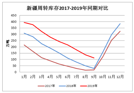 二、新疆棉花库存降幅减缓 截至9月底新疆区内43家仓库商品棉周转库存112.55万吨,环比减少24.63万吨,高于去年同期84.06万吨。