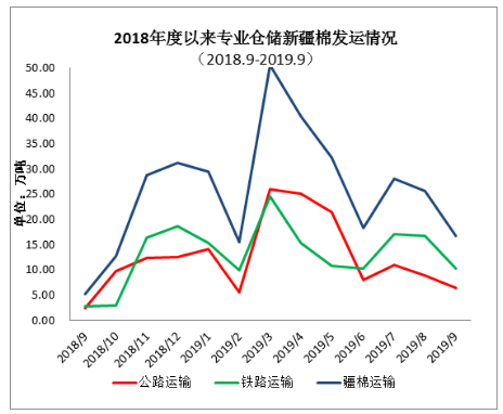 三、专业仓储新疆棉出疆运输 9月新疆棉出疆发运量16.66万吨,环比下降8.96万吨,但高于去年同期11.44万吨。 2019年1-9月出疆棉公路与铁路共发运256.78万吨,同比增加15.78万吨。(来源:中国棉花协会)