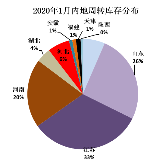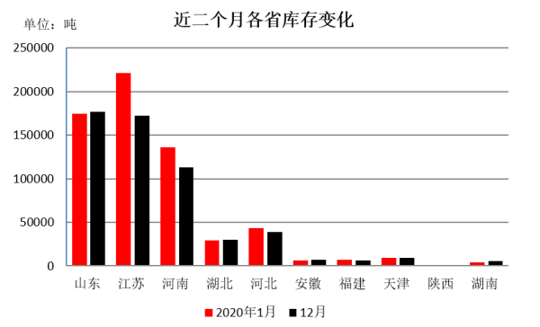 分省份看,江苏省库存量居首位,为22.15万吨,山东省次之为17.44万吨,河南省居第三位为13.56万吨,河北省为4.32万吨,湖北省为2.9万吨,其他省在万吨以下。