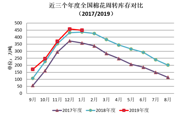 1月,春节来临,用棉企业虽停工放假,但在节前也有不同程度原料补库,月末商品棉周转库存小幅下降。据中国棉花协会棉花物流分会对全国18个省市的152家棉花交割和监管仓库调查数据显示:1月底全国棉花周转库存总量约448.69万吨,较上月减少9.39万吨,高于去年同期12.34万吨。