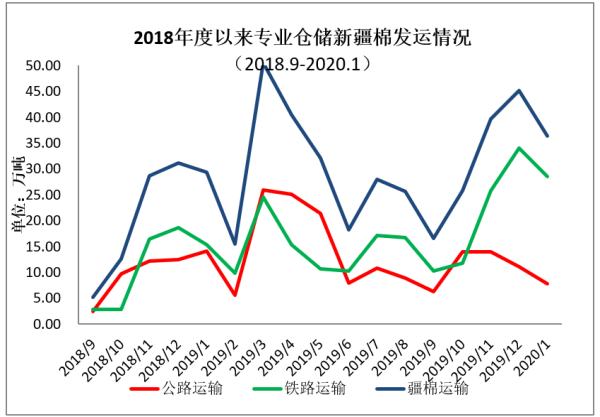 2019年度(2019年9月-2020年1月)出疆棉公路与铁路共发运163.8万吨,同比增加56.63万吨。
