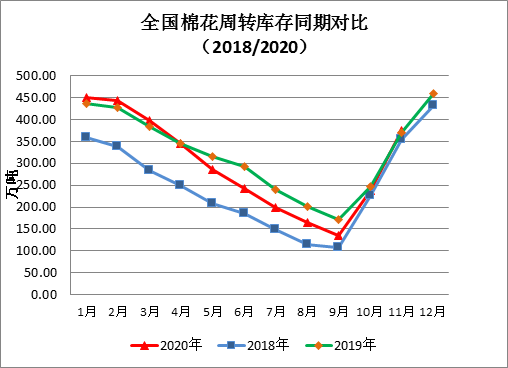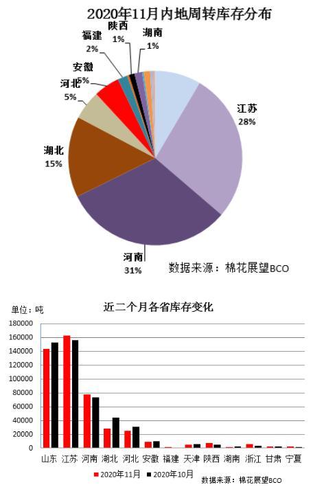项目承担:中国棉花协会棉花物流分会 监测对象:18个省市区154家棉花专业仓储仓库 11月新棉继续大量上市,纺织进入传统淡季,下游消费略显低迷,企业采购新棉积极性不高,月末国内棉花周转库存大幅增加。据中国棉花协会棉花物流分会对全国棉花交易市场18个省市的154家棉花交割和监管仓库的调查数据显示,11月底全国棉花周转库存总量约373.82万吨,较上月增加136.78万吨,增幅57.70%,高于去年同期3.7万吨。
