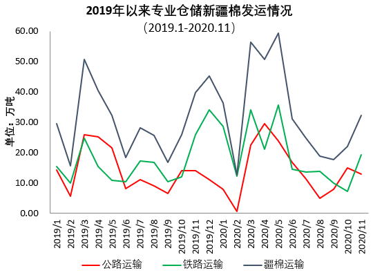 二、新疆棉花库存大幅增加 截至11月底新疆43家仓库商品棉周转库存为326.34万吨,环比增加138.06万吨,同比增加1.82万吨。 三、专业仓储新疆棉出疆运输 11月新疆棉花专业仓储库出疆发运量为32.16万吨,环比增加10.23万吨,低于去年同期7.59万吨。 2020年(2020年9月-2020年11月)出疆棉公路与铁路共发运71.65万吨,同比下降10.57万吨。
