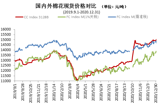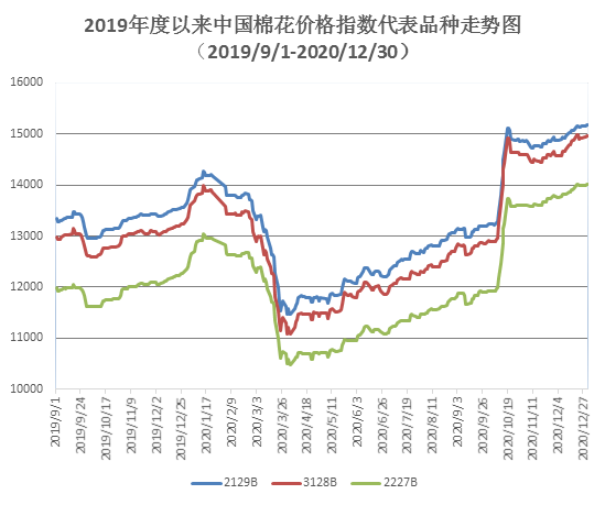 项目承担:北京棉花展望信息咨询有限责任公司 监测对象:18个主要棉花生产、消费省的100家棉纺织企业 12月,国内棉花收购和加工接近完成,新棉加工量持续增长,市场资源量充裕,纺织行业下游需求好转,对棉花原料补库需求和采购热情持续升温,国内棉花价格延续上涨,成品纱线以及粘胶和化纤等产品价格也均有不同程度上涨。同期,国际棉价震荡上涨,但涨幅低于国内棉花现货,1%关税下外棉现货价格仍低于国内棉花现货价格。 一、国内外现货价格变化情况 1、国内现货价格延续上涨 12月,国内新棉收购以及加工工作持续开展,市场新棉资源量继续增加,陈棉消耗即将殆尽,新棉成为市场销售资源主体,国内棉花市场资源量充裕。月内纺织订单旺盛,需求大增,国内棉花现货价格继续上涨,并创年度新高。月末,中国棉花价格指数(CCIndex3128B)14963元/吨,较上月末上涨312元;月均价为14793元/吨,环比上涨260元,同比上涨1639元。