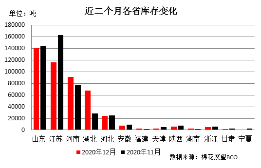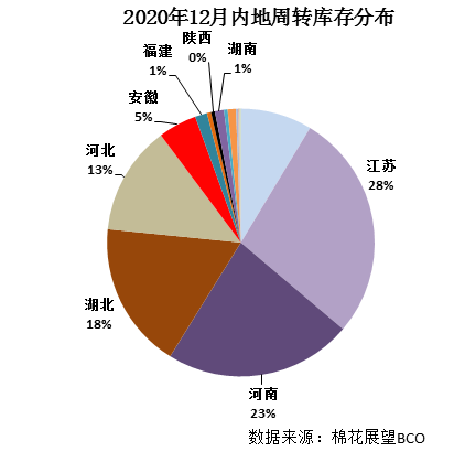 一、内地商品棉周转库存微降 截至12月底,内地商品棉周转库存46.68万吨,环比下降0.8万吨;含新疆棉28.05万吨,已通关进口棉10.47万吨,地产棉8.16万吨。 分省份看,山东省库存量占首位,为14.07万吨,江苏省次之为11.59万吨,河南省居第三位为9.06万吨,湖北省为6.75万吨,河北省为2.38万吨,其他省在万吨以下。 从库存量变化情况看,该月库存减少的省份多于增加的省份,整体减量大于增量。其中降幅最大的是江苏省,较上月减少4.74万吨;其次是山东省,较上月减少0.34万吨;天津减少0.3万吨;安徽减少0.2万吨;库存增加的省份为湖北省增加3.94万吨;河南省增加1.29万吨;其他省份波动幅度在0.2万吨以下。