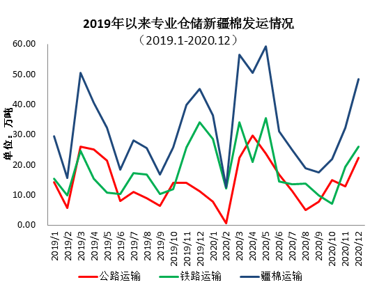 二、新疆棉花库存继续大幅增加 截至12月底,新疆43家仓库商品棉周转库存为397.81万吨,环比增加71.47万吨,同比下降4.23万吨。 三、专业仓储新疆棉出疆运输 12月,新疆棉花专业仓储库出疆发运量为48.31万吨,环比增加16.15万吨,高于去年同期3.08万吨。 2020年(2020年9月-2020年12月)出疆棉公路与铁路共发运119.96万吨,同比下降7.49万吨。