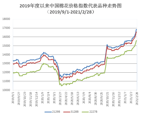 项目承担:北京棉花展望信息咨询有限责任公司 监测对象:18个主要棉花生产、消费省的100家棉纺织企业 2月,国内外疫情控制好转,今年春节各地推行“就地过年”,棉纺织行业提前复工复产,下游纺织需求旺盛,对棉花原料采购量大幅增加,加上通胀预期强烈,大宗商品市场持续上涨,带动棉花价格上扬。下游纺织品消费向好,成品销售顺畅且价格大幅上涨,成品纱线以及粘胶和化纤等产品价格均有千元以上涨幅。同期,国际棉价震荡上涨,但月末出现回落,总体涨幅低于国内,内外棉现货价差收窄后再次扩大。 一、国内外现货价格变化情况 1、国内现货价格保持上涨 2月,国内纺织需求和消费继续向好,在纱价大幅上涨的传导下,国内棉花价格继续上涨。纺织行业在春节前采购量大幅增加,节后采购量小幅减缓。月底,中国棉花价格指数(CCIndex3128B)为16558元/吨,环比上涨1315元;月均价为15826元/吨,环比上涨549元,同比上涨2408元。