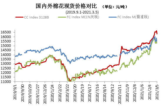 4、纺织成品价格大幅上涨 2月,纺织市场下游需求与消费持续向好,订单量大增,纺织成品销售价量齐升。具体看,纯棉纱KC32S和精梳JC40S月末成交价为26080元/吨和30680元/吨,较上月末分别上涨2000元/吨和2100元/吨;涤纶短纤月末为8000元/吨,较上月末上涨1850元,粘胶短纤月末为15500元/吨,较上月上涨2000元/吨。 二、影响国内外价格变化的要素分析 1、储备棉轮入仍未启动 按照储备棉轮入公告,2020年12月1号到2021年3月31号期间,内外棉价差低于800元/吨则启动轮入,但2月份内外棉价差在最低时达到815元/吨,储备棉轮入依旧未能启动。 2、郑棉期货较上月上涨,注册仓单增量减缓 2月,郑棉期货整体先涨后跌,整体较上月上涨。主力合约CF105月末结算16410价元/吨,较上月末的14850元/吨上涨1560元/吨,涨幅9.51%。月末注册仓单17779张,折71.11万吨,较上月末增加4.04万吨,增量环比减缓。 3、出疆棉数量略有下降,运价略有调整 2月,出疆棉总计发运35.56万吨,较1月份减少近5万吨左右,减幅12.3%。从运输方式来看,公路发运量下滑明显,铁路发运量高于近三个年度同期。运输价格,大部分出疆棉运输路线公路运价有小幅下跌,乌鲁木齐铁路集团公司各货运中心发往内地各局到站的皮棉棚车运价下浮优惠幅度进行了调整,整体上调5%,60棚车下浮标准由20%上调至15%,70棚车下浮标准由30%上调至下浮25%。 4、纺织行业订单充足 2月份纺织行业延续向好,棉纱市场行情持续火热,纱线价格一路上涨。三、四月份也将迎来纺织行业传统旺季,目前多数纱厂订单基本都到了四五月份,而且利润也处在几年内较高水平。虽然纺企的原料库存较为充足,但较高的开工率和开机率用棉消耗和速度将会增大,预计3月中下旬会有集中补库出现。 (来源:中国棉花协会)