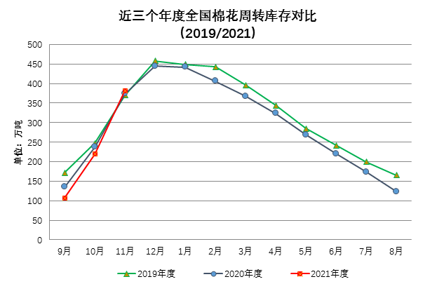 项目承担:中国棉花协会棉花物流分会 监测对象:18个省市区154家棉花专业仓储仓库 11月储备棉投放成交量增加,企业竞拍活跃。月底各棉区收购进入尾声,加工量和上市资源量持续增加,市场资源供应充足。纺织企业因下游需求不畅,新增订单较少,开机不足,对棉花需求依然较弱。月末国内棉花周转库存大幅增加,增幅环比扩大。据中国棉花协会棉花物流分会对全国棉花交易市场18个省市的154家棉花交割和监管仓库的调查数据显示,11月底全国棉花周转库存总量约381.93万吨,环比增加162.82万吨,增幅较上月扩大,高于去年同期8.11万吨。