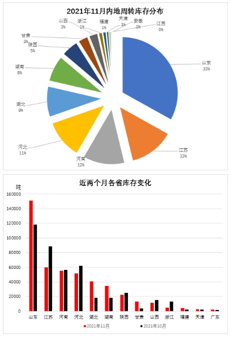一、内地商品棉周转库存小幅增加 11月内地周转库存为45.65万吨,环比增加3万吨。其中新疆棉31.62万吨,已通关进口棉3.75万吨,地产棉10.28万吨。 分省份看,山东省库存量居首位为15.10万吨,江苏省次之为6万吨,河南省居第三位为5.55万吨,河北省5.17万吨,湖北省4.07万吨,湖南省3.46万吨,陕西省2.24万吨,甘肃省1.29万吨,山西省1.15万吨;其他省均在1万吨以下。 从库存量变化看,各消费大省环比呈现不同程度增减,其中增幅最大的为山东省,增加3.26万吨;湖北省次之增加2.26万吨;湖南省增加1.60万吨;其余省份增幅在千百吨上下。部分省份库存较上月减少,其中减少幅度最大的省份为江苏省,减少2.85万吨;河北省次之减少1.04万吨;浙江省减少8.25万吨,剩余个别省份减幅在百十吨上下。