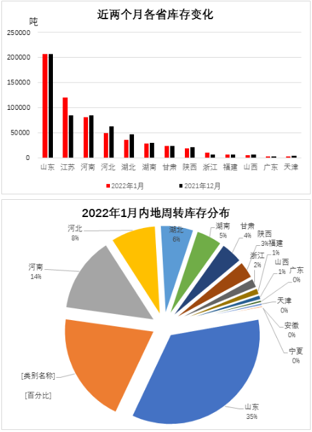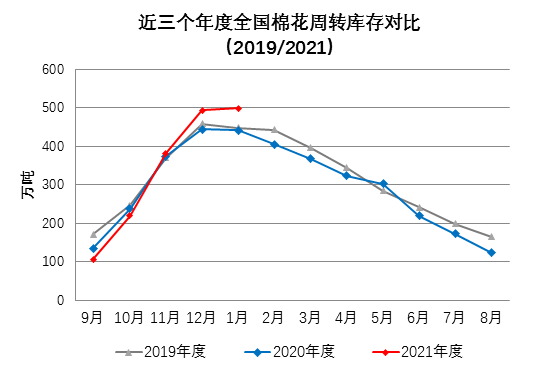 项目承担:中国棉花协会棉花物流分会 监测对象:18个省市区154家棉花专业仓储仓库 1月全国棉花上市资源量持续增加,资源供应充足。纺织企业下游需求略有好转,在春节前适量补充棉花原料库存,但棉花总体购销进度依然缓慢。月末国内棉花周转库存小幅增加,增幅环比缩小。据中国棉花协会棉花物流分会对全国棉花交易市场18个省市的154家棉花交割和监管仓库的调查数据显示,1月底全国棉花周转库存总量约499.18万吨,环比增加5.03万吨,增幅较上月大幅缩小,高于去年同期57.11万吨。