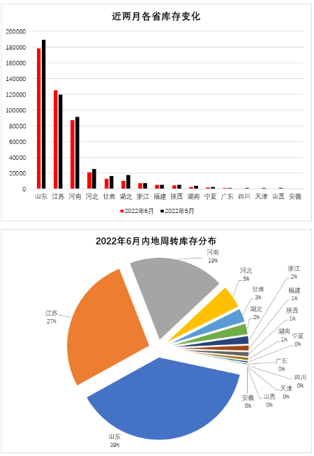 一、内地商品棉周转库存略减 6月,国内棉花现货价格弱势大幅下跌,纺织厂逢低适量补库,内地周转库存有所减少。具体为:6月内地周转库存为46.22万吨,环比减少2.81万吨。其中新疆棉36.98万吨,已通关进口棉3.9万吨,地产棉5.34万吨。分省份看,山东省库存量居首位为17.86万吨,江苏省次之为12.53万吨,河南省居第三位为8.74万吨,河北省为2.14万吨,甘肃省为1.29万吨,湖北省1.03万吨,其他省均在1万吨以下。 从库存量变化看,部分主要棉花主产和消费大省环比大幅减少。其中减幅最大的省为山东省,减少1.12万吨;湖北省次之,减少0.74万吨;河南省减少0.44万吨;河北省减少0.42万吨;甘肃省减少0.35万吨。少数省份环比略增,其中增幅最大的为江苏省,增加0.56万吨;剩余省份上下增减的幅度在几百吨上下。