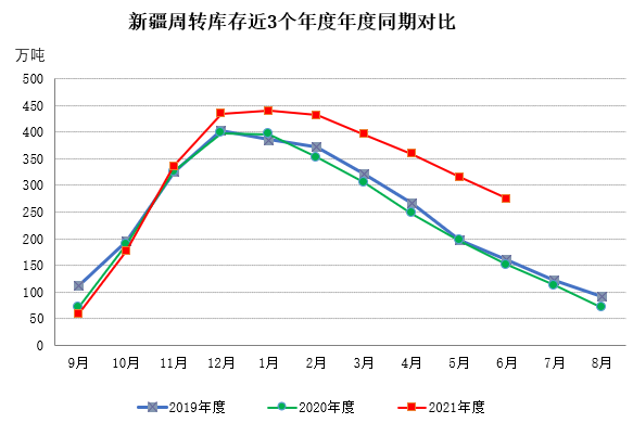 二、新疆棉花周转库存大幅减少 截至6月底,新疆43家仓库商品棉周转库存为275.39万吨,环比减少40.51万吨,减幅环比下降,同比增加124.15万吨。
