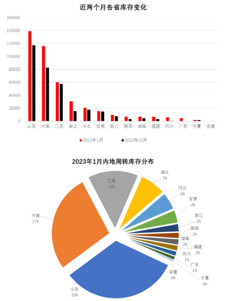 一、内地商品棉周转库存环比大幅增加 1月出疆棉环比有所减少,受春节假期影响,纺织厂补库需求不高,内地商品棉周转库存量较上月大幅增加,各产销大省库存明显增加。1月内地商品棉周转库存42.86万吨,环比增加10.09万吨。其中新疆棉36.21万吨,已通关进口棉3.6万吨,地产棉3.05万吨。 分省份看,山东省库存量居首位13.94万吨,河南省次之11.61万吨,江苏省居第三位6.03万吨,湖北省3.05万吨,河北省2.06万吨,甘肃省1.52,其他省均在1万吨以下。 从库存量变化情况看,大部分棉花生产和消费省环比增加,其中增幅最大的为河南省,增加3.32万吨;山东省次之,增加2.23万吨;湖北省增加1.54万吨;四川省增加0.52万吨;广东省增加0.42万吨;陕西省增加0.39万吨;福建省增加0.36万吨;江苏省增加0.27万吨;湖南省增加0.26万吨;部分省增加一千吨上下。