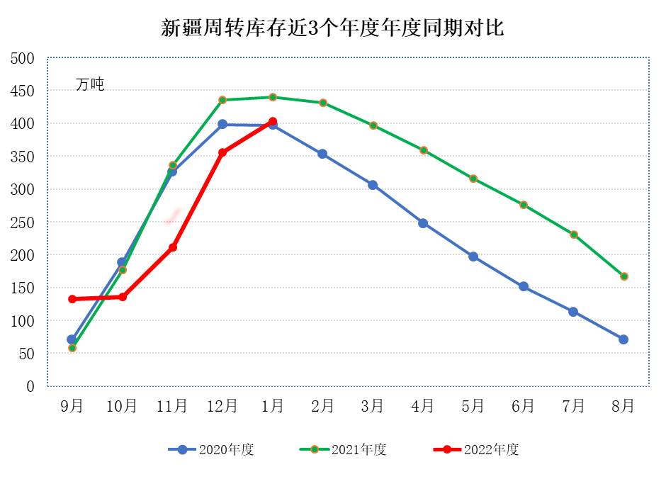 二、新疆棉花周转库存继续增加 截至1月底,新疆43家仓库商品棉周转库存为403.05万吨,环比增加47.27万吨,增幅环比大幅缩小;同比减少36.76万吨。