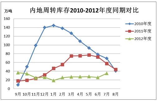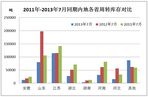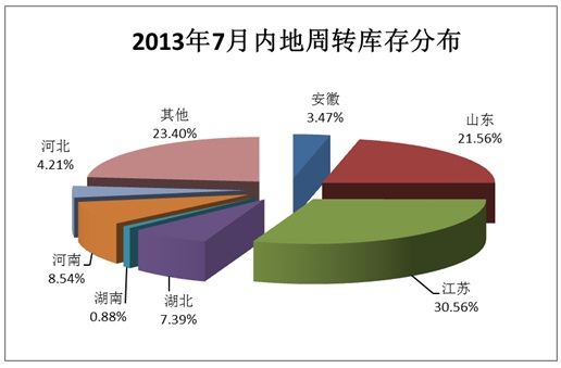 储备棉竞拍已于7月底结束,本轮投放累计成交372万吨。最后一个月纺织企业竞拍积极,成交量明显增加,导致商品棉周转库存环比有所增长,但仍大幅低于上年同期。新疆棉铁路运输以储备棉为主,公路运输以商品棉为主。7月公路出疆车辆960车,环比减少741车,自3月15日至7月31日,累计出疆车辆5038辆。 中国棉花协会棉花仓储分会对158家仓储会员单位统计,截至2013年7月底,商品棉周转库存总量为37.3万吨(其中内地库35.3万吨、新疆库2万吨),环比增加10.4万吨,同比减少34.6万吨。商品棉周转库存仍以进口棉和新疆棉为主,其中新疆棉占36%,地产棉占13%,进口棉占51%。据此推算,全国商品棉周转库存总量约为46.24万吨,较上月增加10.86万吨。当月,新疆区内23家中转站通过铁路向内地发运商品棉0.9万吨,环比增加0.6万吨,同比减少8万吨。 一、 内地商品棉周转库存情况 截至7月底,内地135家棉花仓库的商品棉周转库存量35.3万吨,环比增加9.6万吨,同比减少22万吨。内地商品棉周转库存中,新疆棉占32%,地产棉占14%,进口棉占54%。 从内地库存分布来看,山东和江苏库存量最大,超过一半,其次是安徽、河南、河北。其中江苏30%,与上月持平;山东21%,环比下降8个百分点;河南10%,环比下降2个百分点;安徽3%,环比下降1个百分点;河北4%,环比上升1个百分点;湖北7%,环比上升4个百分点;湖南1%,与上月持平。 二、新疆商品棉周转库存情况 截至7月底,新疆区内23家仓库商品棉周(中)转库存为2万吨,环比增加0.8万吨,同比减少12.6万吨。库存全部为新疆棉。 以上中转站当月通过铁路向内地发运商品棉0.9万吨,环比增加0.6万吨,同比减少8万吨。据此推算,7月底新疆棉在途量约0.2万吨。 (中国棉花协会) 声明:凡于本网文章前标有“CTEI网讯”之文章即表示为本网原创、编译、第一信息源、第一媒体合作方等,如需转载请务必标注文章来源自“中国纺织经济信息网 www.listentoy.com”,本网保留法律权利。
