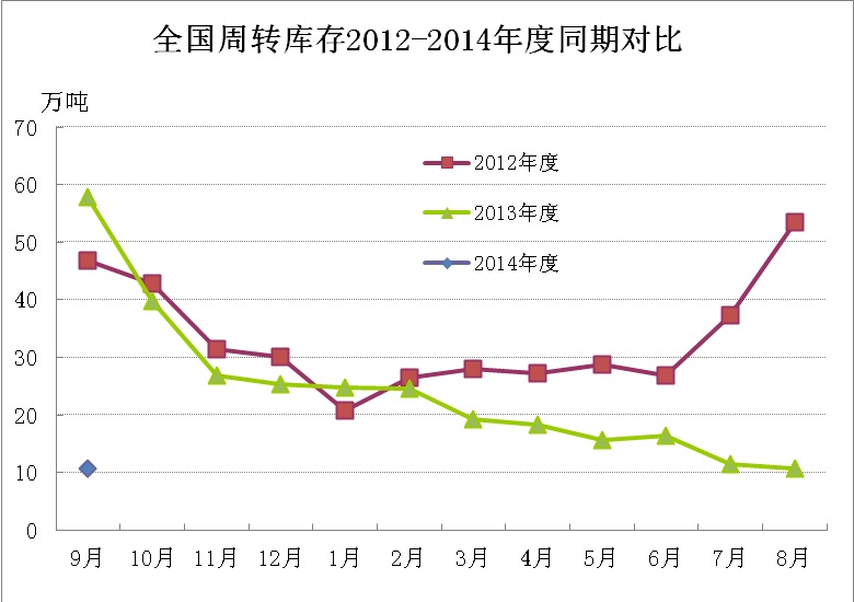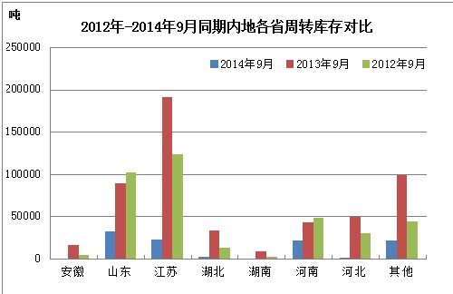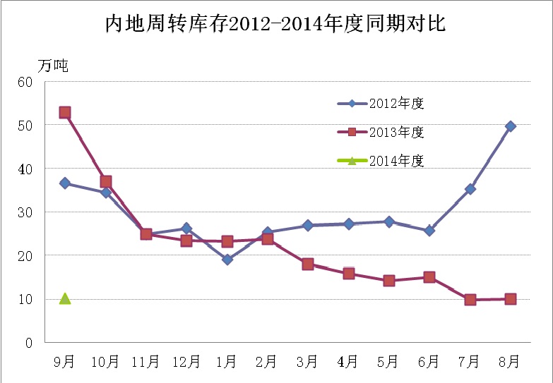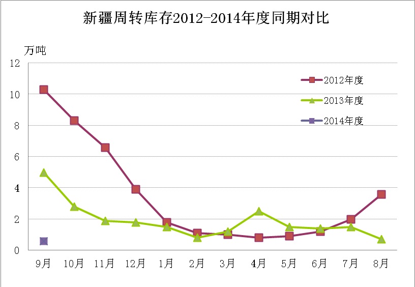 9月,新棉陆续开秤收购。新疆受播种前期气温偏低影响,棉花吐絮采摘较往年推迟,加之棉花企业和棉农等待新疆棉花目标价格改革试点工作实施方案发布,9月上中旬收购进度迟缓,下旬开秤企业逐步增多,但收购量大幅低于上年同期,基本没有新棉入库;内地部分棉区开秤,收购进度总体慢于上年同期,新棉少量入库。商品棉周转库存仍以进口棉和前期成交储备棉为主,总量环比微幅增长,同比仍大幅下降八成以上。新疆棉铁路运输以储备棉为主,公路运输以商品棉为主,本月公路出疆棉1.6万吨,环比减少0.2万吨。 中国棉花协会棉花仓储分会对148家仓储会员单位统计,截至9月底,商品棉周转库存总量为10.72万吨(其中内地库10.15万吨、新疆库0.57万吨),环比增加0.02万吨,同比减少47.18万吨。商品棉周转库存以进口棉和新疆棉为主,其中进口棉占51%,新疆棉占46%,地产棉占3%。据此推算,全国商品棉周转库存总量约为13.3万吨,较上月增加0.1万吨。当月,新疆区内27家中转站通过铁路向内地发运商品棉0.3万吨。