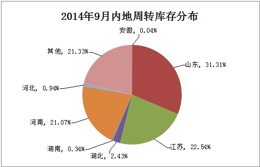 一、内地商品棉周转库存情况 截至9月底,内地122家棉花仓库的商品棉周转库存量10.15 万吨,环比增加0.15万吨,同比减少42.75万吨。内地商品棉周转库存中,进口棉占54%,新疆棉占42%,地产棉占4%。 从内地库存分布来看,山东和江苏库存量最大,其次是河南、湖北、河北。其中山东31%,环比上升6个百分点;江苏23%,环比下降10个百分点;河南21%,环比上升9个百分点;湖北2%,与上月持平;河北1%,与上月持平;湖南0.3%,环比上升0.2个百分点。