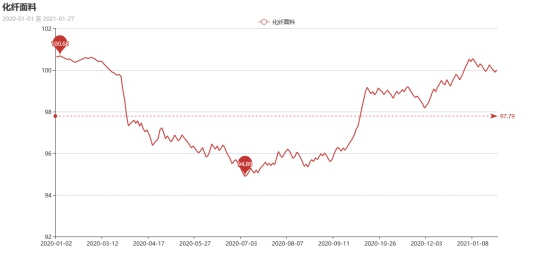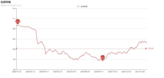 织造方面,随着春节假期到来,受到疫情影响,大部分返乡的外来员工已经启程,市场开工率下降明显,现盛泽地区开工率在5成左右,库存方面,由于产能降低,厂家陆续还在发货,因此库存维持前期,在41天左右,目前市场成交气氛一般,厂家多在清账,做收尾工作,预计后市行情还将稳中走弱。 二、从原料市场行情来看 化学纤维也小幅上涨,收盘于104.01点,与上一交易日相比,上涨了0.13点。