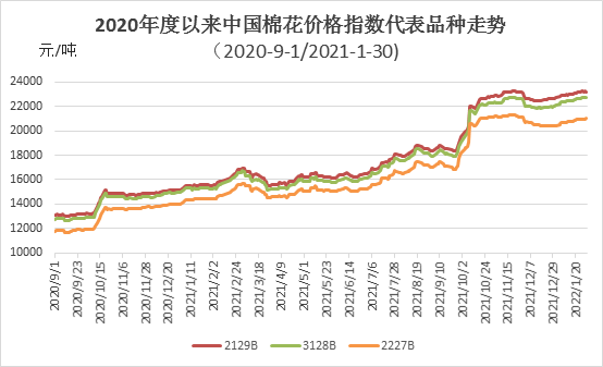 2、长绒棉延续上涨 1月,在国内外棉价大幅上涨带动下,国内长绒棉价格持续上涨。但因价格高,纺织企业需求较弱,实际成交依旧偏弱。月底137级成交价46000元/吨,环比上涨1500元,高于同期中国棉花价格指数(CCIndex3128B)23283元,价差较上月末扩大890元。 3、国际棉价上涨,内外棉价差缩小 1月,全球大宗商品价格持续上涨,受此影响,国际棉花期现货价格较大幅上涨。中国进口棉价格指数FCIndexM月均134.93美分/磅,环比上涨11.15美分;月底138.19美分/磅,环比上涨8.38美分,1%关税下折人民币21570元/吨,低于同期国内现货1157元,内外棉价差较上月末缩小589元。