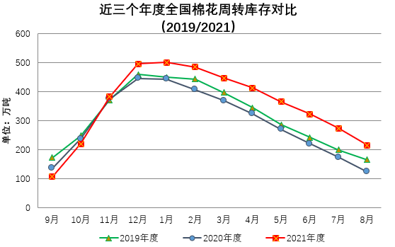 项目承担:中国棉花协会棉花物流分会 监测对象:18个省市区154家棉花专业仓储仓库 8月,全国棉花市场资源供应充足,国内棉价止跌趋稳,棉企加大力度积极促销。纺织厂渐入旺季,下游需求有所好转,多数纺织厂在棉价止跌企稳之际积极补充原料库存,需求明显好于上月,国内棉花周转库存持续大幅减少,且仍高于去年同期。据中国棉花协会棉花物流分会对全国棉花交易市场18个省市的154家棉花交割和监管仓库的调查数据显示,8月底全国棉花周转库存总量约215.15万吨,环比减少58.46万吨,降幅21.37%,高于去年同期92.14万吨。