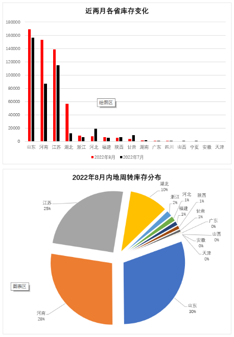 一、内地商品棉周转库存环比增加 8月,纺织市场进入旺季,用棉需求转好,疆棉移至内地库大幅增加,内地商品棉周转库存量较上月有所增加。具体为:8月内地周转库存为48.58万吨,环比增加6万吨。其中新疆棉41.24万吨,已通关进口棉3.83万吨,地产棉3.51万吨。分省份看,山东省库存量居首位为16.89万吨,河南省次之为15.31万吨,江苏省居第三位为13.92万吨,湖北省为5.68万吨,其他省均在1万吨以下。 从库存量变化情况看,棉花主产和消费大省环比大幅增加。其中增幅最大的省为河南省,增加6.59万吨;湖北省次之,增加4.44万吨;江苏省增加2.42万吨;山东省增加1.25万吨,浙江省增加0.23万吨;减幅最大的为河北省,减少1.15万吨;甘肃省减少0.58万吨。