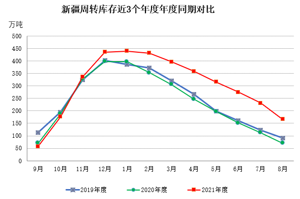 二、新疆棉花周转库存大幅减少 8月纺织需求略好转,疆棉外运大幅增加,截至8月底,新疆43家仓库商品棉周转库存为166.57万吨,环比减少64.46万吨,减幅环比大幅增加;同比增加96.13万吨。