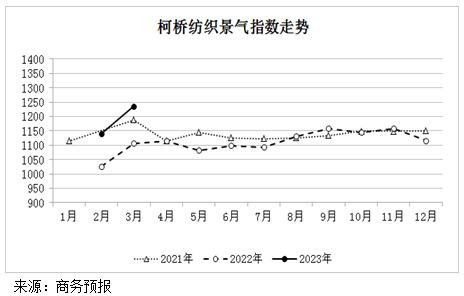 2023年3月份柯桥纺织景气指数为1235.31点,环比上涨8.3%。其中,坯布类景气指数1833.81点,上涨28.9%;服饰辅料类景气指数1335.16点,上涨13...">