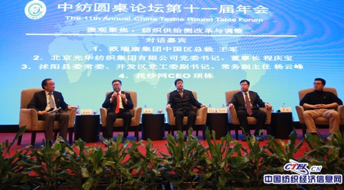 17:00 孙淮滨:谢谢来自德国的Reinhard Muehlenmeister的先生,讲的很专业,也很细致。时间过的很快,已经到了5点,我们还有一个环节,就是对话互动。下面我们有请4位嘉宾上台,欧瑞康集团中国区总裁王军、北京光华纺织集团有限公司党委书记、董事长程庆宝、沭阳县委常委、开发区党工委副书记杨云峰、找纱网CEO顼栋。 他们4位对话嘉宾,都代表不同的企业代表或者产业集群。王总是设备供应商,我想大家都认识,我们程董事长代表加工制造环节,我们杨书记代表产业集群,因为我们沭阳是最大的包覆纱生产基地,而且现在还在建设智能产业园,顼栋先生的姓很特别,他是来自于互联网平台的。今天的题目就是从微观层面谈一下供给侧改革与调整,你们从不同的角度也可以对这个问题发表看法,因为这个还是探索。当然它也是长短结合的国家政策,当然它也会落地,怎么落地,你们肯定有自己的想法和看法,首先从王总开始。