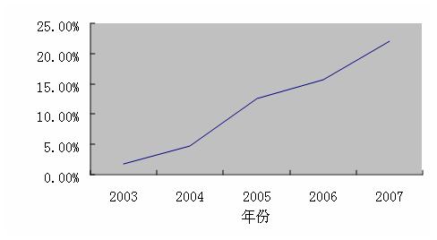 2003~2007年出口土耳其聚酯合成长丝纱线占我国出口总量的比例如图1所示: