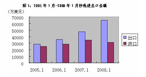 2008年1月份我国纱线共计出口10.55亿美元,同比增长31.99%;进口3.11亿美元,同比下降9.93%。图14为2005年以来每年1月份我国纱线的进出口金额对比情况。由图1可以看出出口额始终大于进口额,出口额逐年增加,而进口额今年一月同比下降。