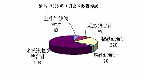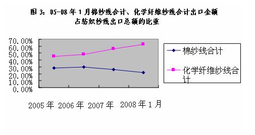 纱线的出口大类主要有毛纱线、丝纤维纱线、麻纤维纱线、棉纤维纱线和化学纤维纱线见图2-08年1月出口纱线构成图。其中棉纱线和化纤纱线为主要出口产品,今年1月份二者出口额之和占出口总额的85%,仅化纤就占近2/3的份额,自05年以来化纤纱线的比重逐年增多,而棉纱线自06年以来呈逐渐下降趋势见图3所示。