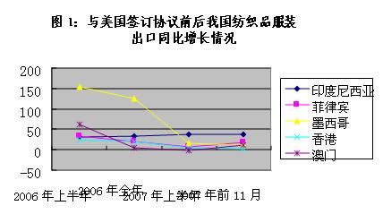 图1表明与美国签订协议前后除出口到印度尼西亚之外,我国纺织品服装出口到这些国家在2006年全年和2007年上半年同比增幅有非常明显地回落,2007年前11月的同比增幅较上半年略有回升(可能与2006年增幅下降基数不是很大有关),有力地说明了不管我国的纺织品服装以前有没有通过这些国家进行非法转移出口到美国,美国采取贸易与别国签订类似的协议对我国的出口还是影响很大的。