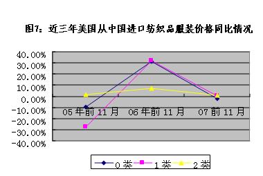 近三年来美国从我国进口纺织品服装的数量同比增速呈现逐年下降趋势,主要是由于05年刚刚取消多年的配额限制,我国的出口能力得到了“井喷式”释放,接着遭受了中美贸易大战,以及我国出口企业逐步趋于理性,出口市场多元化,导致了06年和07年出口数量同比逐年下降的结果。价格方面06年较05年增长幅度较大,增幅高达31.26%,07年价格基本与06年持平,这是由于 “十五”期间产业结构调整的结果,我国纺织品服装的附加值有所提高,06年在出口美国的价格方面得到了初步体现,而美元贬值步伐的加快,又直接影响了07年价格指数的增长。