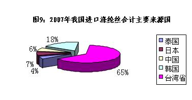 金额较大的涤纶丝合计和锦纶丝合计,这两种产品的主要来源国都为台湾省,所占份额都超过2/3,它们各自的来源国分别见下面图所示。