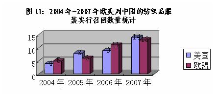 欧盟:“非食品类产品快速预警系统(RAPEX)”,是欧盟于2001年依据《欧盟通用产品安全指令》修正案而设立的。2004年-2007年欧盟对中国的纺织品服装实行召回的项数和美国相当,并且都呈现逐年递增的趋势。但在产品的特点和采取措施上有别于美国,欧盟实行召回的产品一类是属于物理因素(占62%),主要涉及儿童类服装,主要由纽扣、绳索等物理因素引起的安全问题(这一类与美国相同),另一类(占38%)是由于偶氮、镉等化学物质引起安全问题,主要产品涉及童装,工装等。采取的惩罚性手段上也不一样。欧盟轻则由进口商自愿撤出市场并召回,严重一点则由主管部门禁止销售,撤出市场并召回,更严重的是主管部门命令从市场撤销产品并从消费者处召回产品。