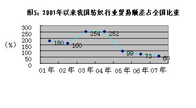 前几年由于我国纺织品出口大于进口,净创汇稳居各行业之首,纺织工业对外贸易的发展为国家积累了大量的外汇,为稳定人民币汇率、增加外汇储备做出了重要贡献。03年、04年纺织行业净创汇占全国总数的比重高达250%以上,自05年以来已低于全国总数,并且比重呈现逐年下降趋势,为国家提出“减顺差”政策作出了较好的回应。