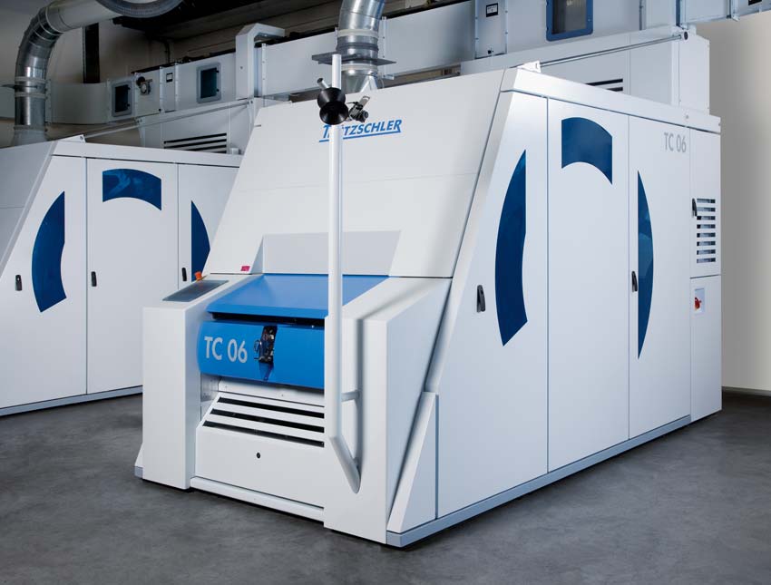 因此,Trützschler提供了一种特别适应该生产要求的梳棉机,TC 06。机器的配置均针对高梳理质量的同时又能充分利用其生产能力而选配。在TC 06上,设定优化工具T-Con同MULTI WEBCLEAN 系统一样属于标准配置。而驱动装置却设计的更小,因为无需达到400m/min的输出速度,这样的设计使其生产能力发挥得更好。